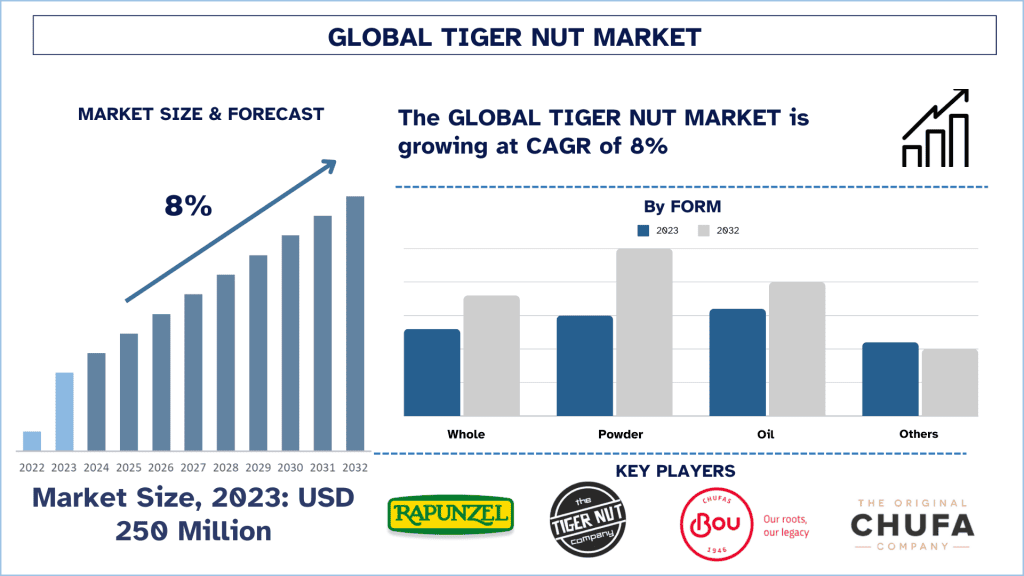 As per their “Tiger Nut Market” report, the global market was valued at ~USD 250 million in 2023, growing at a CAGR of about 8% during the forecast period from 2024-2032 to reach USD billion by 2032.